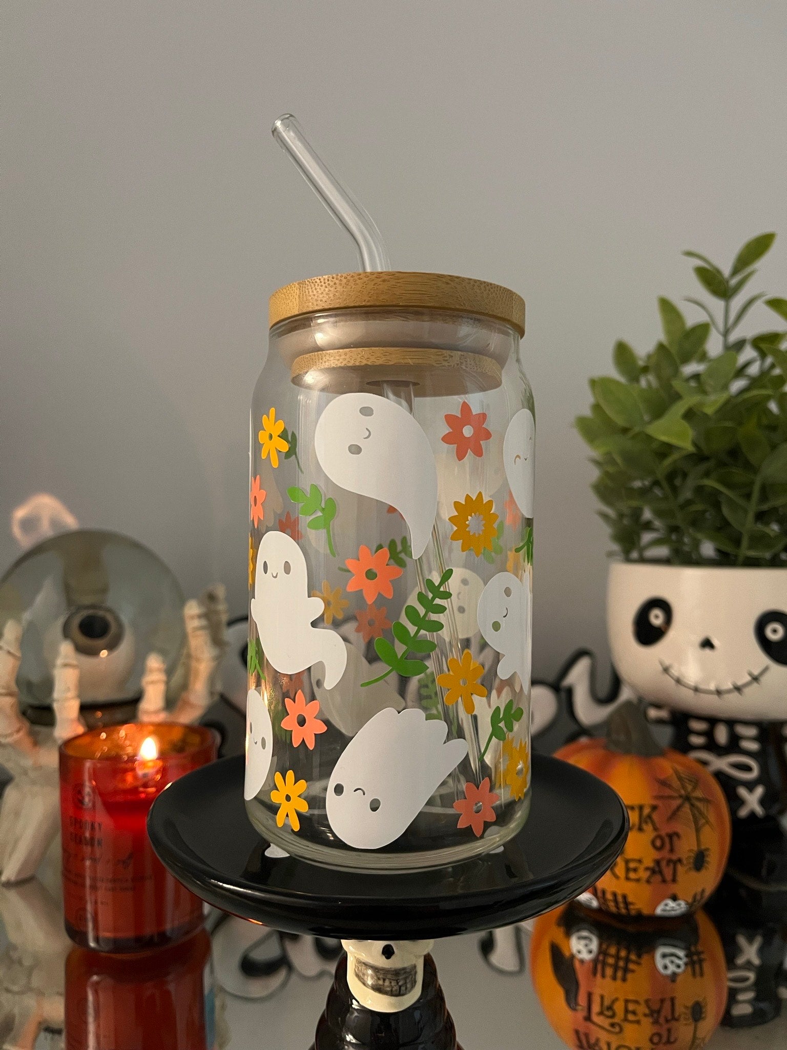 Cute Floral Ghost Can Glass